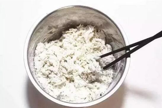 2、把酵母水慢慢的倒入面粉里,一边倒一边搅拌,直到没有干面粉就可以了。