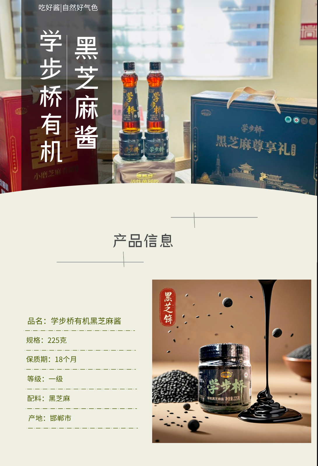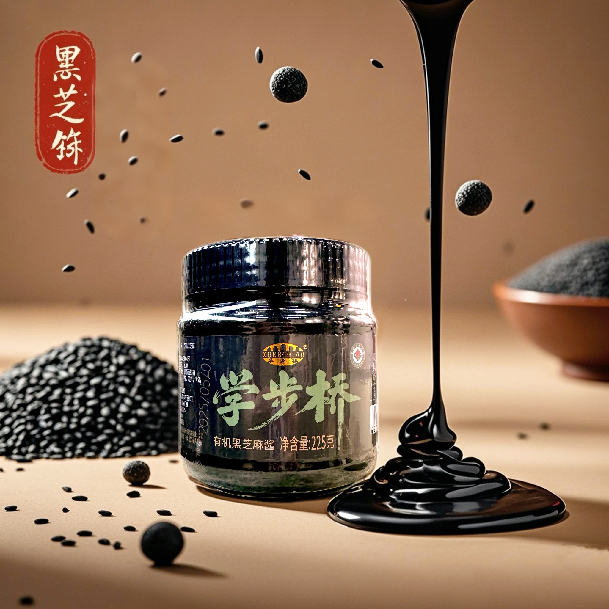 学步桥有机黑芝麻酱,以纯粹的有机内核,在香气与营养间找到了完美平衡。有机种植,颗颗纯净用来磨酱的黑芝麻,来自坚持有机耕作的田间。不撒化肥,只施草木灰与有机肥;不喷农药,靠人工除草和生物防治守护作物。饱满的芝麻粒在阳光下积累油脂与养分,采收后经严格筛选,只留颗粒均匀、色泽乌亮的果实,从源头保证每一口的纯净。沿用传统石磨工艺,低温慢研锁住芝麻的本真香气,开盖瞬间,浓郁的芝麻香直窜鼻尖,带着烘烤后的焦香与坚果的醇厚,可用于涂抹面包、拌凉菜、制作甜品等。