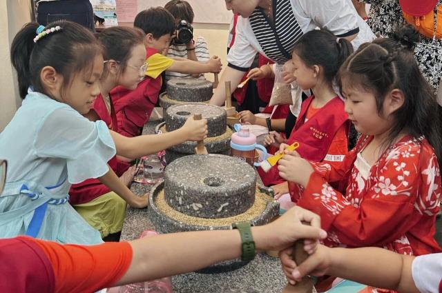 最让小记者们兴奋的是工艺体验环节。在传统石磨区,大家分组围站在古朴的石磨旁,挽起袖子轮流尝试推磨。“好沉呀!”第一次推磨的小记者有些吃力,但在小伙伴的合力帮助下,石磨慢慢转动起来,磨盘间逐渐渗出细腻金黄的芝麻碎。