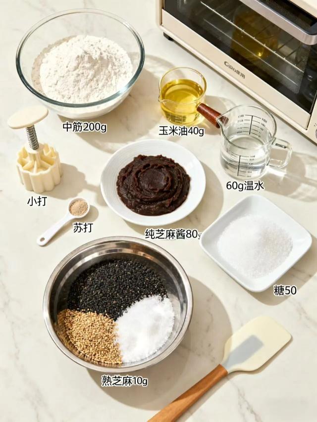 • 饼皮:中筋面粉200g、纯芝麻酱80g(选无添加的,香更浓)、玉米油40g、白糖50g、温水60g、小苏打 2g
