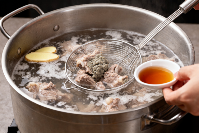 •去膻关键:羊肉切块后,用冷水浸泡1小时,泡出血水;焯水时加姜片、料酒、葱段,膻味去一半;