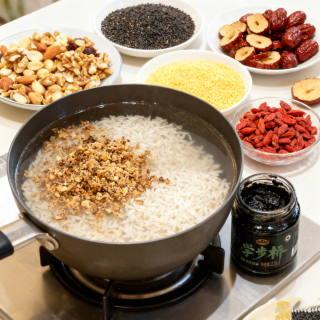 •核心食材:学步桥黑芝麻酱2-3勺(约30g,粥的“灵魂”)、混合坚果 50g(核桃、花生、杏仁等,提前碾碎)