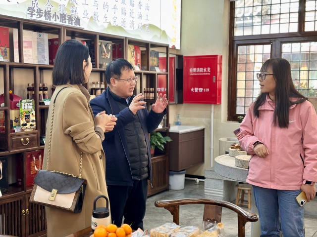 随后,他引领嘉宾们参观了学步桥香油文化馆,结合石磨器具、历史展板等陈列,分享了品牌传承与产业发展历程,并重点阐述了公司在经济互助活动中的核心举措——依托自身渠道与品牌优势,为合作商家提供资源对接、技术支持等服务,推动产业链上下游协同发展。期间,身着传统服饰的工作人员演示了小磨香油古法制作工艺,让协会同仁在感受非遗文化魅力的同时,进一步了解了公司的产业实力与发展潜力。
