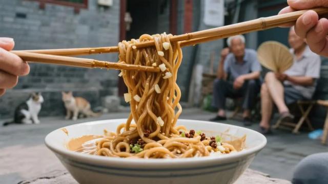 码菜也有讲究:黄瓜丝要切得细如发丝,绿豆芽得用沸水焯到断生,再配上点焯过的菠菜段。把酱一浇,菜一撒,筷子搅开的瞬间,芝麻香混着菜香直往鼻子里钻,呼噜噜吃下去,额头上冒点小汗,暑气全消。