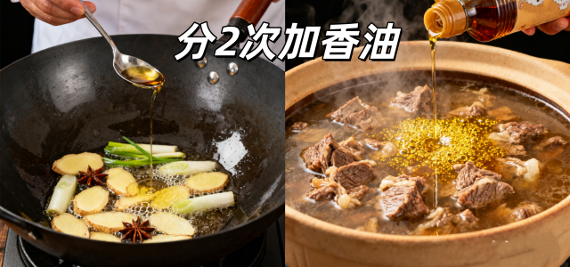 第二次,出锅前加1勺:牛肉汤炖好后,淋入1勺学步桥小磨香油。这一步能让香油的香气“浮”在汤面,一掀开锅盖就香气扑鼻,喝的时候每一口都能尝到香油的醇厚。