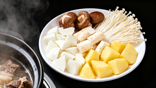 •根茎类:萝卜(润肺)、山药(健脾)、土豆(补能量),切成滚刀块,在牛肉炖到1小时时加入,煮到软烂即可。