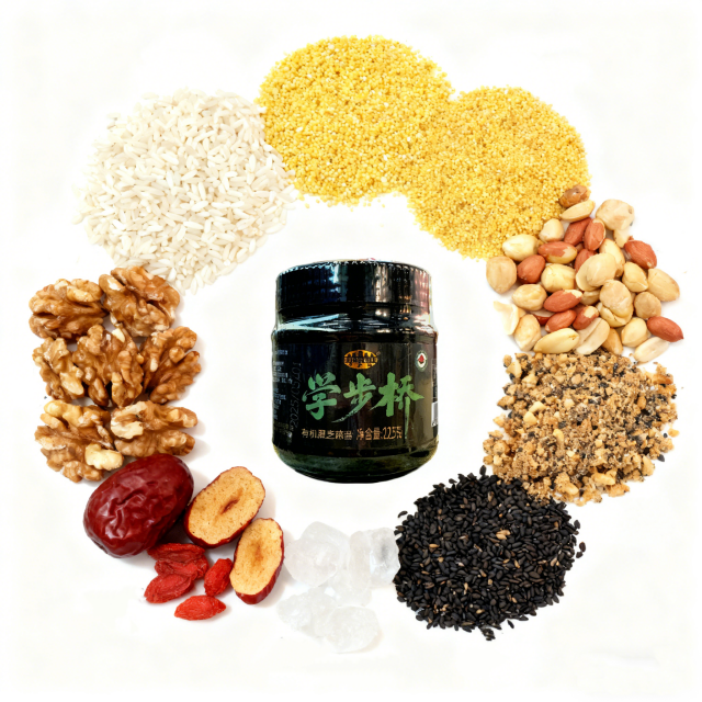 •核心食材:学步桥黑芝麻酱2-3勺(约30g,粥的“灵魂”)、混合坚果 50g(核桃、花生、杏仁等,提前碾碎)