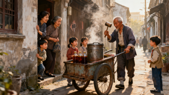 那时候的香油没有花哨的品牌,它的“广告”是走街串巷的油梆子声。“梆——梆——”,清脆的敲击声穿透清晨的薄雾,掠过巷口的老槐树,像一句无声的召唤,总能让巷子里的主妇们纷纷探出头来。卖香油的老汉推着一辆旧手推车,车上有个铁质的黑乎乎的香油桶,当香油桶的盖子打开时,一股浓郁的芝麻香便争先恐后地涌出来,瞬间弥漫整条街巷。孩子们会围着香油车打转,眼神里满是好奇与渴望,那香气像有魔力,勾得人直咽口水。