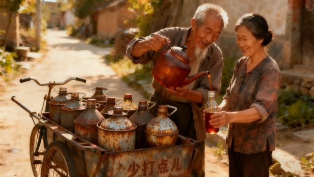 买香油是件庄重的事,妈妈会拿着家里的空瓶,小心翼翼地递给老汉。老汉则从车后取下一套油提子——黄铜打造的提子分了大小,一两、二两、半斤,提柄上被磨得锃亮,透着岁月的包浆。“紧打酒,慢打油”,这是老辈人传下的规矩,打油时动作要慢,提子深入油瓮时要稳,提起时要缓缓倾斜,让香油顺着提子的边缘慢慢流淌,这样才能让油提子“吃”足香油,不至于因动作过快而洒漏。老汉的动作娴熟而专注,香油顺着提子的弧度缓缓注入瓶中,形成一条细细的、发亮的油线,那香气也随之愈发浓郁,让人忍不住想凑近嗅一嗅。妈妈总会在一旁叮嘱:“少打点儿,省着用。”一瓶半斤的香油,往往能用上一两个月。