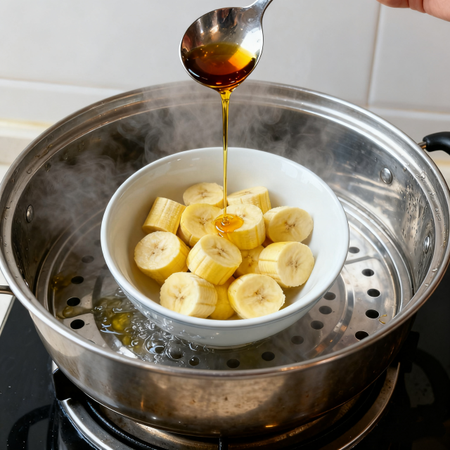 2.向碗中的香蕉段淋上 1 勺学步桥小磨香油,然后将碗放入蒸锅,待蒸锅水烧开后,用中火蒸 8 分钟;