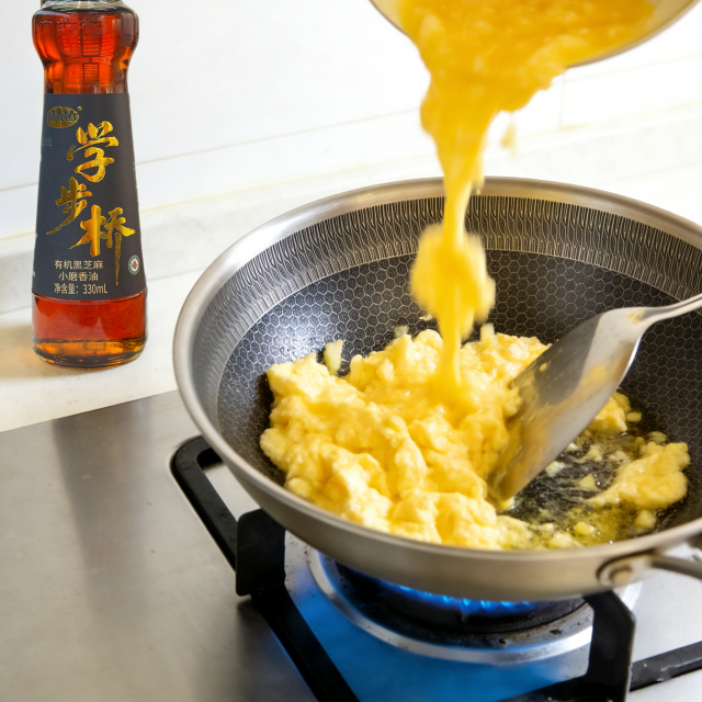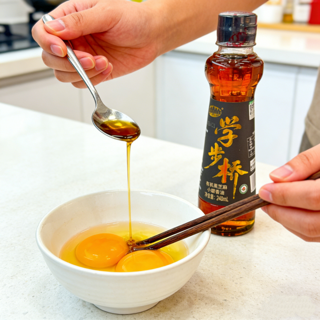 【原料准备】鸡蛋2个、学步桥有机黑芝麻小磨香油3汤匙