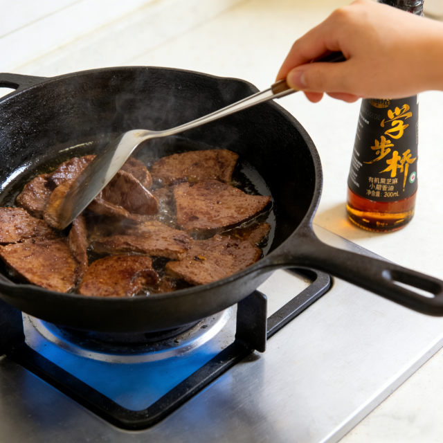 【原料准备】羊肝100g(切片)、学步桥有机黑芝麻小磨香油2勺、少许盐