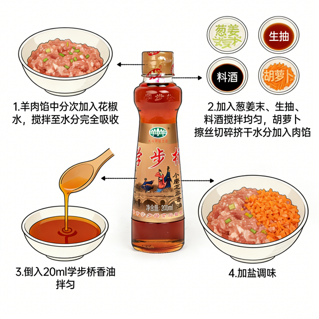 【食材准备】羊肉馅500g、胡萝卜2根、花椒水适量、葱姜末适量、生抽2勺、料酒1勺、盐适量、学步桥小磨香油黄金香油比例:500g羊肉馅 + 20ml香油