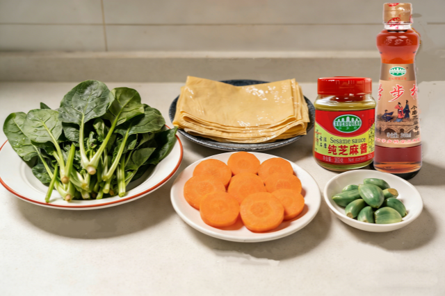 主料:菠菜250克、油豆皮150克、胡萝卜100克、腊八蒜5-6瓣