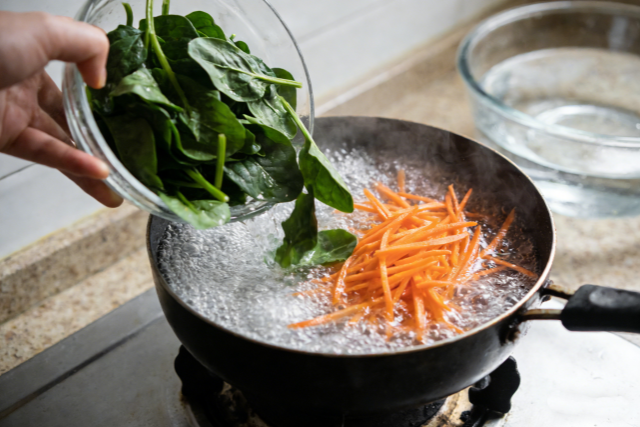 1.处理食材:菠菜、胡萝卜洗净,胡萝卜切细丝备用;锅中烧沸水,放入菠菜和胡萝卜丝快速焯水,水再次沸腾后立即捞出,放入冷水中过凉,攥干多余水分,避免菜品软烂。
