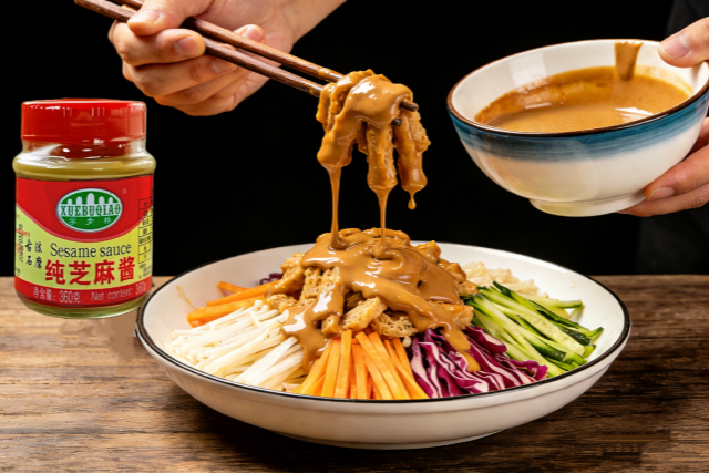 3.调制灵魂麻酱汁:取一个干净小碗,放入学步桥芝麻酱,先加入学步桥香油充分搅拌,让芝麻酱完全化开,再依次加入腊八醋、生抽、食盐、白糖、鸡精,最后加少许清水微调浓度,搅拌至浓稠可流动状态即可。
