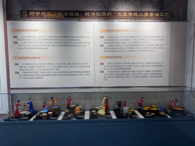 最让孩子们着迷的,莫过于非遗工艺观赏与现场研磨体验。馆内的工艺沙盘展示着“一粒芝麻巧变香油”的神奇:大名小磨工艺遵循“水代法”传统,从芝麻筛选、慢火炒制到石磨研磨、兑浆搅油、震荡分油撇油,每一道工序,都尽显匠心,这也是小磨香油香气醇厚的秘诀所在。