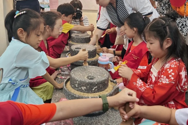 在石磨体验区,孩子们还可以亲手转动磨盘,看着饱满的芝麻粒在磨盘间跳舞,华丽变身为金黄喷香的芝麻碎,成就感油然而生。免费体验的古法芝麻盐制作,更让孩子们在劳动中感受食物的来之不易。