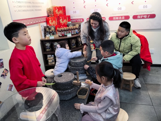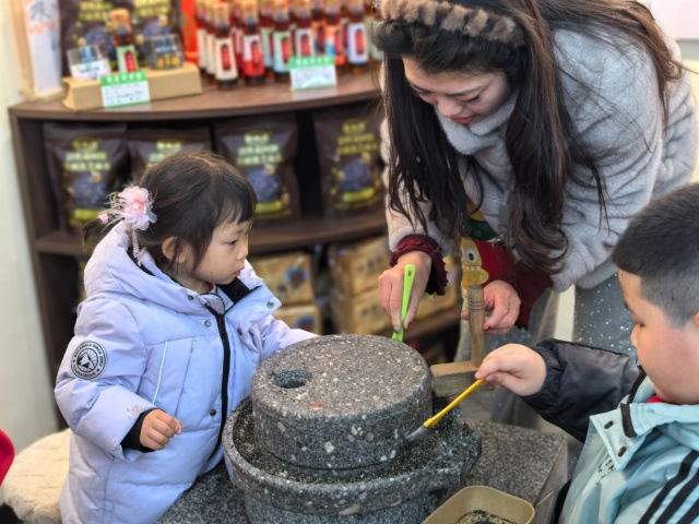 在亲子互动体验区,现场气氛尤为热烈。许多小朋友在家长的陪伴下,亲手转动小石磨,体验磨制芝麻的乐趣。在一推一转之间,孩子们近距离接触传统技艺,感受老手艺的独特魅力,让非遗文化在实践中得到传承与传播。不少家长表示,这样的体验不仅有趣,更有意义,让孩子在游玩中了解家乡文化,感受传统工艺之美。