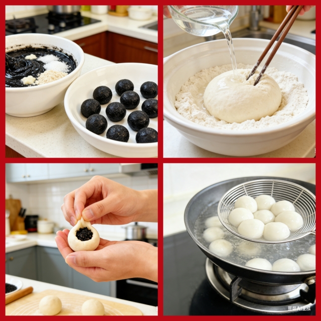3. 包汤圆:取一小块醒好的面团,搓成小圆球,用大拇指在中间按出一个小窝,放入一颗定型好的黑芝麻馅。用虎口慢慢向上推挤,封口后轻轻搓圆,一颗圆润饱满的汤圆就做好了。全程可在手心沾少许熟糯米粉,防止粘手。