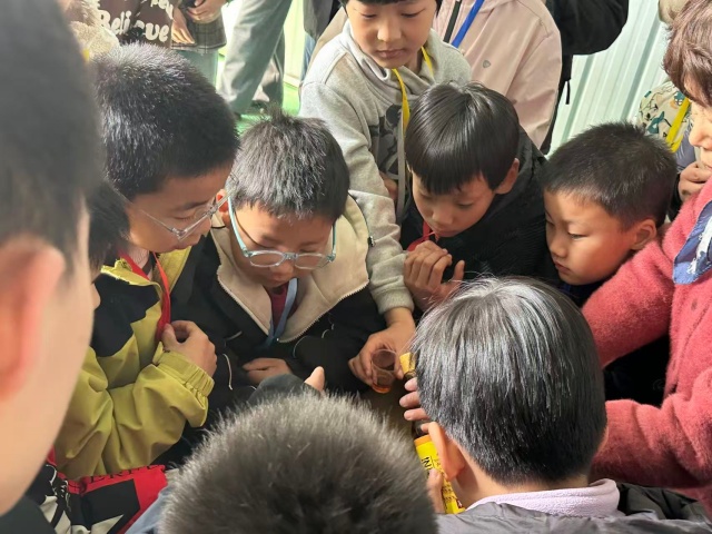 孩子们凑到杯前,用鼻子细细捕捉香气的浓淡与纯正度,再用眼睛观察色泽的通透与质感。通过一嗅一看的精准对比,孩子们敏锐地捕捉到了细微差别,层层筛选后,成功分辨出香油的真伪与优劣,变身嗅觉灵敏、眼光独到的香油鉴别小达人,在趣味实践中练就了一双“火眼金睛”般的鉴赏力。